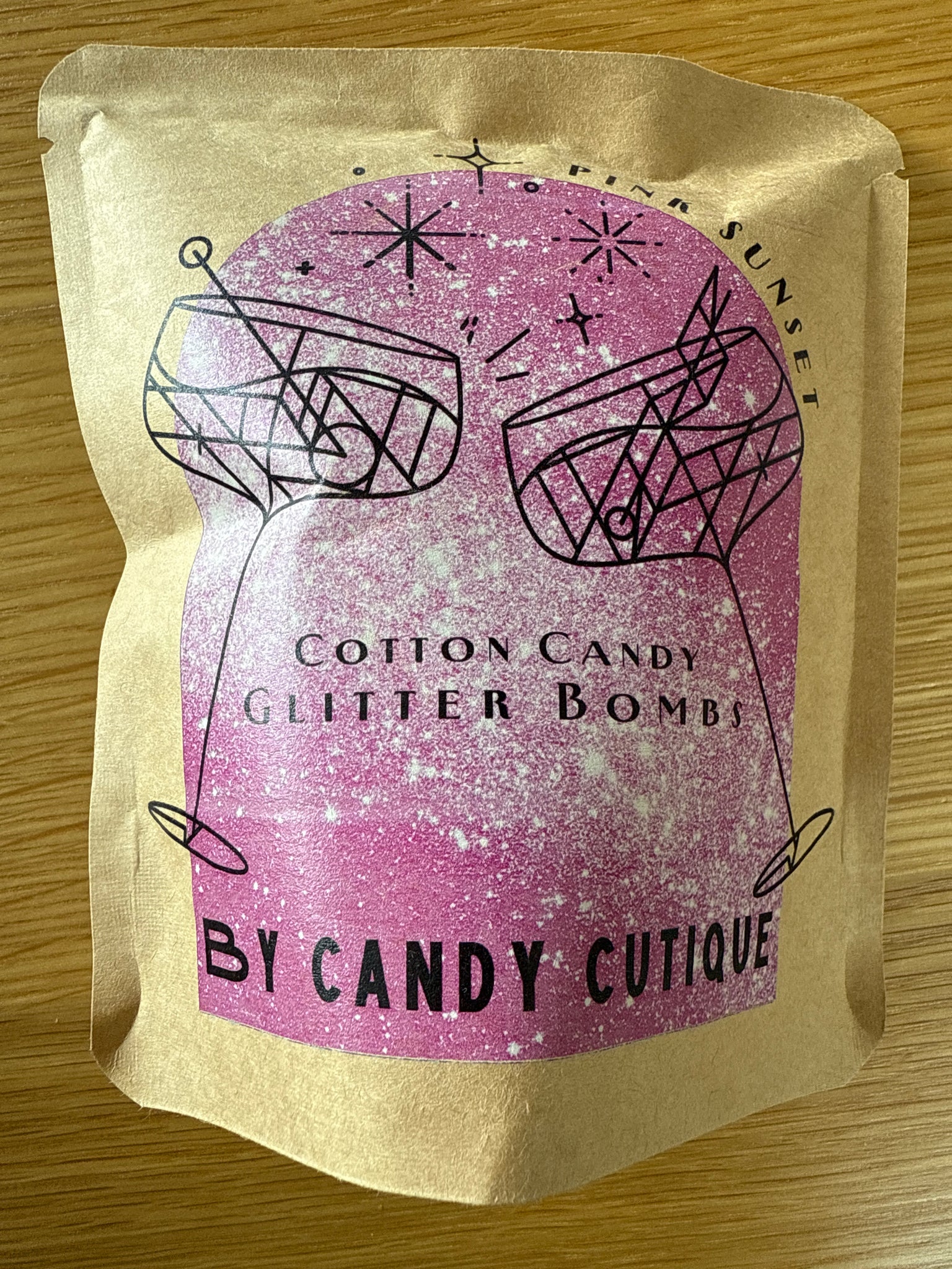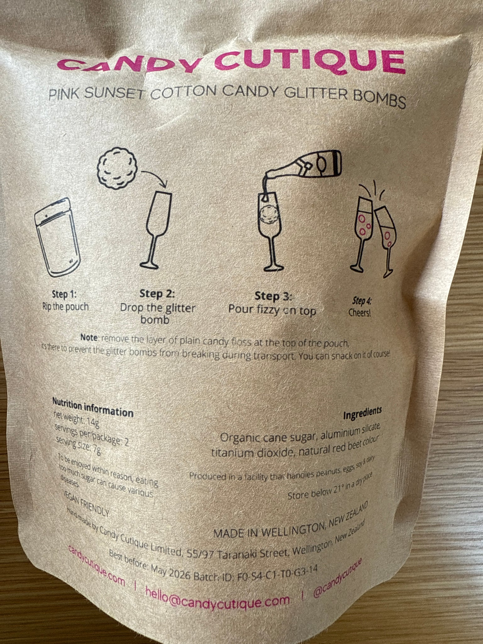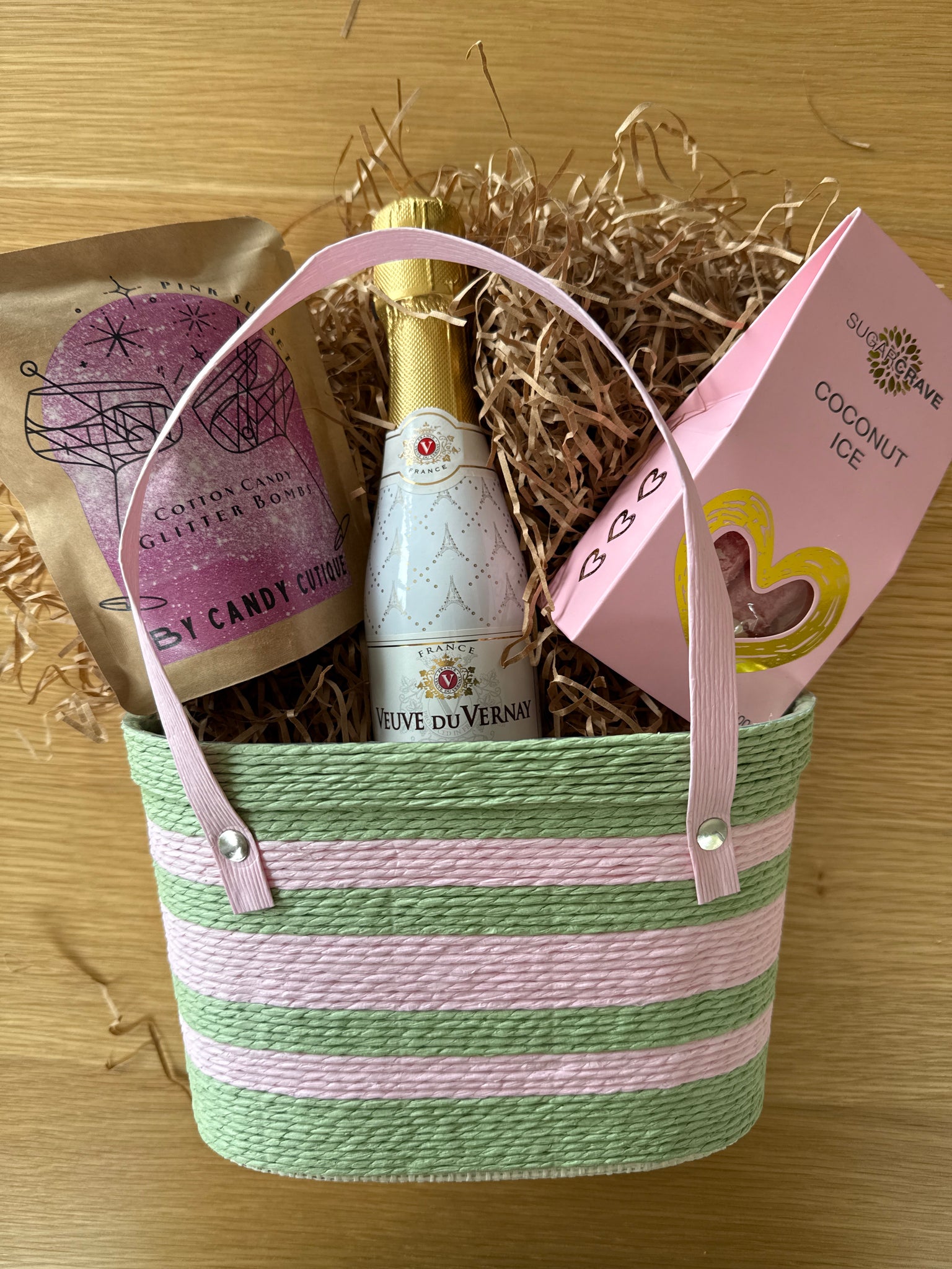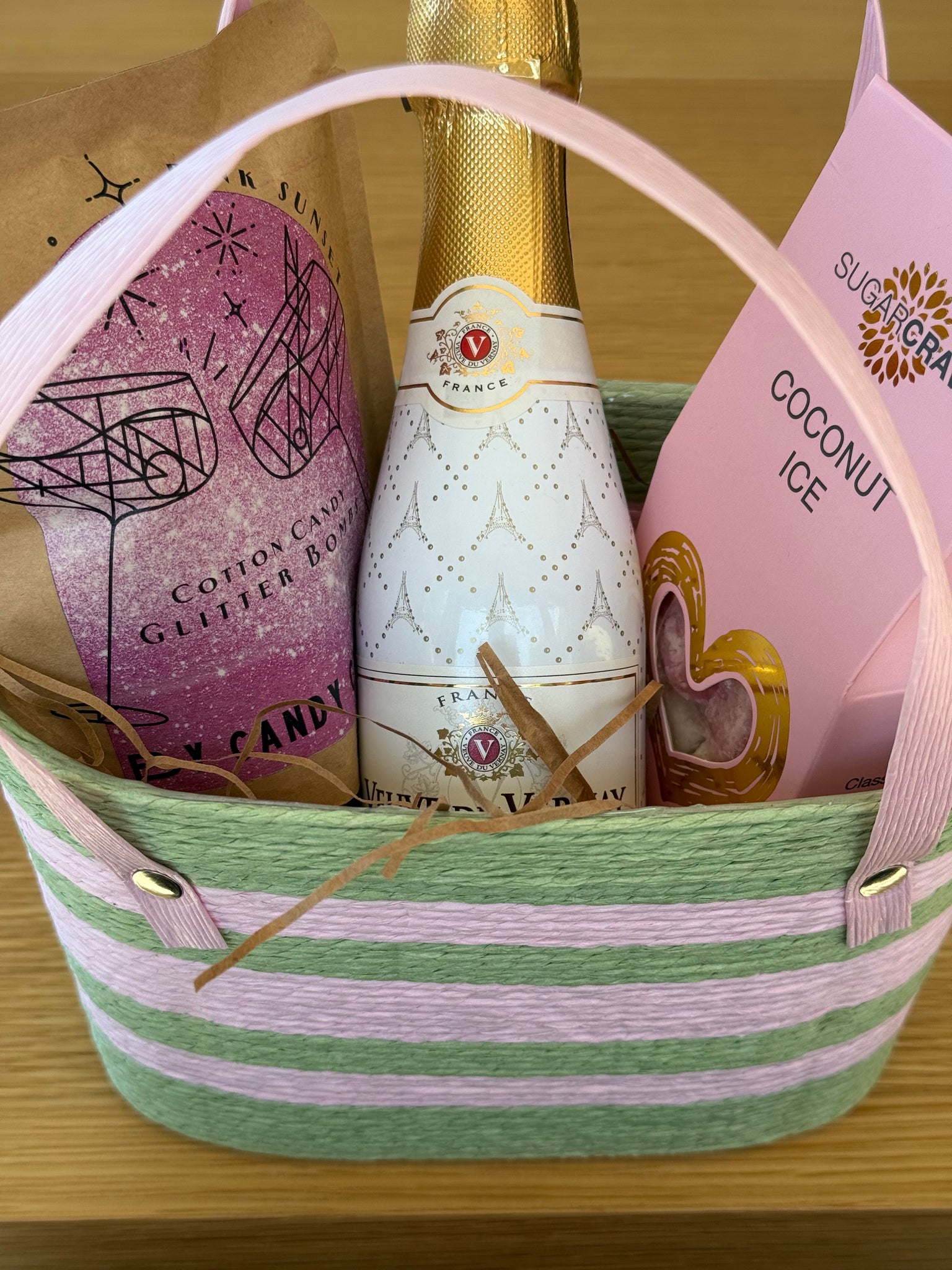 This gift basket includes a small bottle of bubbly wine, fizzy candy floss, to drop into the wine and rich fudge.